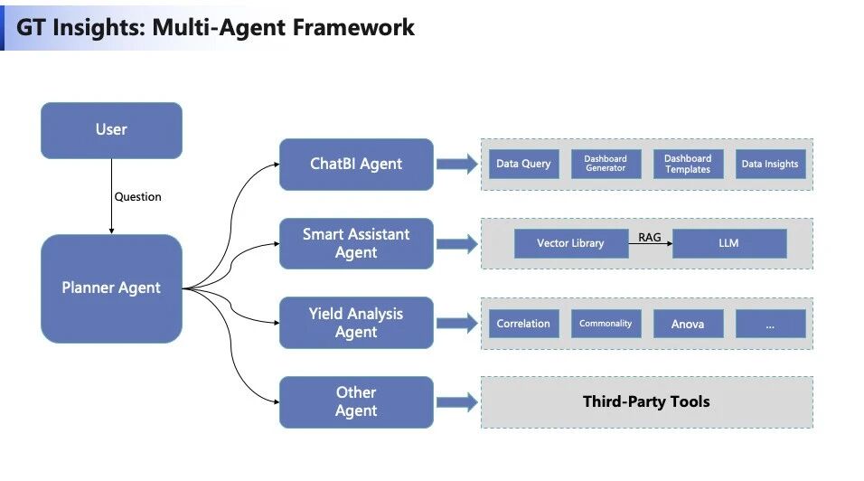 GT Insights的价值不止于单点能力的突破,更在于其作为bbin宝盈东智CIM AI Foundation的重要组成部分,与它基于bbin宝盈东智的Octopus AI Agent平台3.0开发,可通过AI Agent框架,与Planner Agent、Yield Analysis Agent等智能体“数字员工”协同工作。从被动响应走向主动规划分析路径、调用第三方工具(如SPC软件、良率分析插件),形成闭环的分析决策能力。