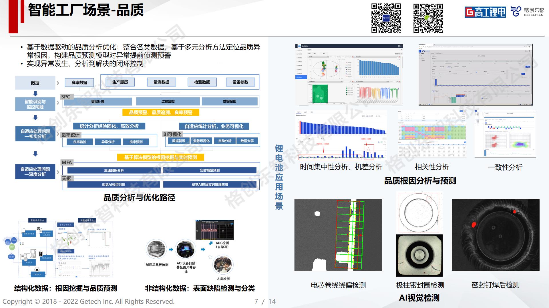 在锂电池工厂里面,也有大量的应用场景,比如机差分析、面密度分析、涂布最优参数组合分析,缺陷检测等等。只有通过全面质量管控才能够高效确保一致性问题,大幅降低制造成本。