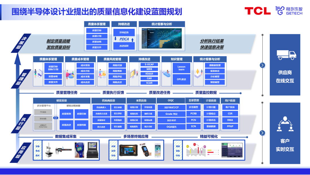 “而行业管理手段的缺失,给质量管理带来诸多难点。在半导体设计业,普遍面临着质量管理业务运行不顺畅、质量数据缺乏集中管理环境、质量数据不能被有效应用、质量实现各阶段缺乏横/纵向协同、集团质量管理中缺乏有效手段等管理痛点。” 基于此,赵志认为,半导体设计工厂质量管理业务要从以下四方面进行规划: