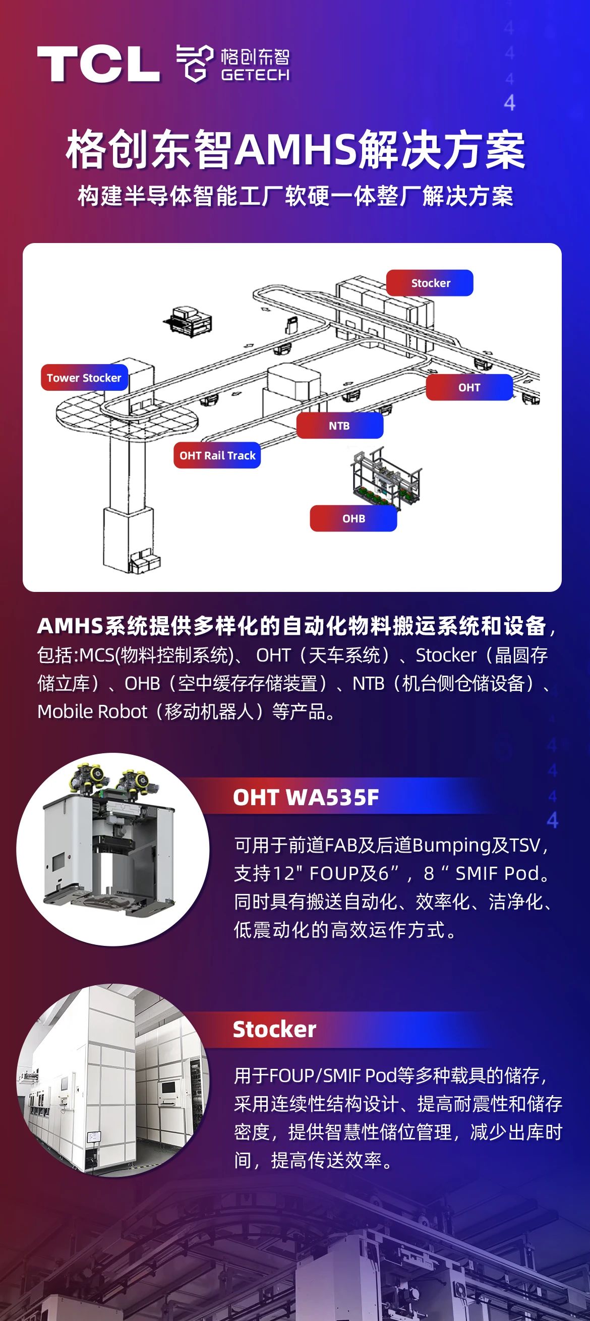 AMHS是半导体工厂极为重要的生产辅助系统,涵盖OHT、Stocker等核心硬件设备,并由MCS、RTD等软件协同运作,在半导体材料、晶圆制造与封装测试环节均有应用,对于提升半导体产线的产能、稼动率、良率等核心生产指标至关重要。