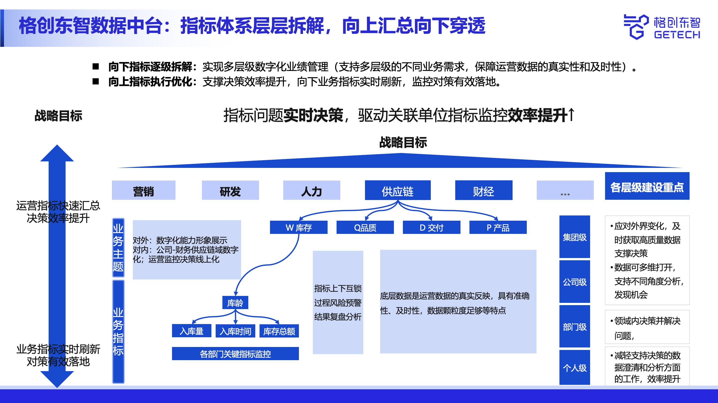 半导体生产过程中会产生大量的数据,包括设备运行数据、产品质量数据、生产流程数据等。搭建数据仓库的目的是为了集中存储和管理这些数据,以便进行深入的分析和处理。bbin宝盈东智数据中台为客户层层拆解指标体系,项目将向下逐级拆解指标,实现多层级数字化业绩管理,支持多层级的不同业务需求,保障运营数据的真实性和及时性。