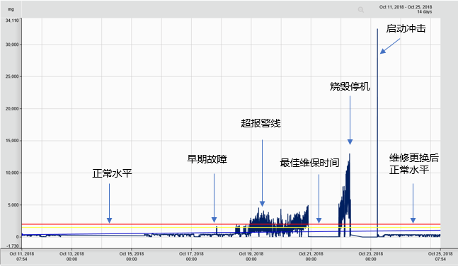在大部分工厂,特别是离散制造业,都是生产是老大,设备只是保障部门,只要还能运转,就不会停产,这导致设备维护改善的时间和资金投入严重不足,设备部也陷入了四处救火、穷于应付的被动恶性循环。究其原因,是因为没有从工厂端到端视角看设备停机的损失。在设备初期征兆的时候介入维护,远比造成停机后再维护,造成的损失和投入成本要小的多。如下图,通过振动分析,可以看到10月18日振动加速度峰值触发早期预警阈值,但是由于生产计划问题,没有停机维护;10月22日机床主控系统触发故障,不得不停机过10个小时维修和更换轴承,维修后,振动恢复正常水平,但巨大损失已经造成。
