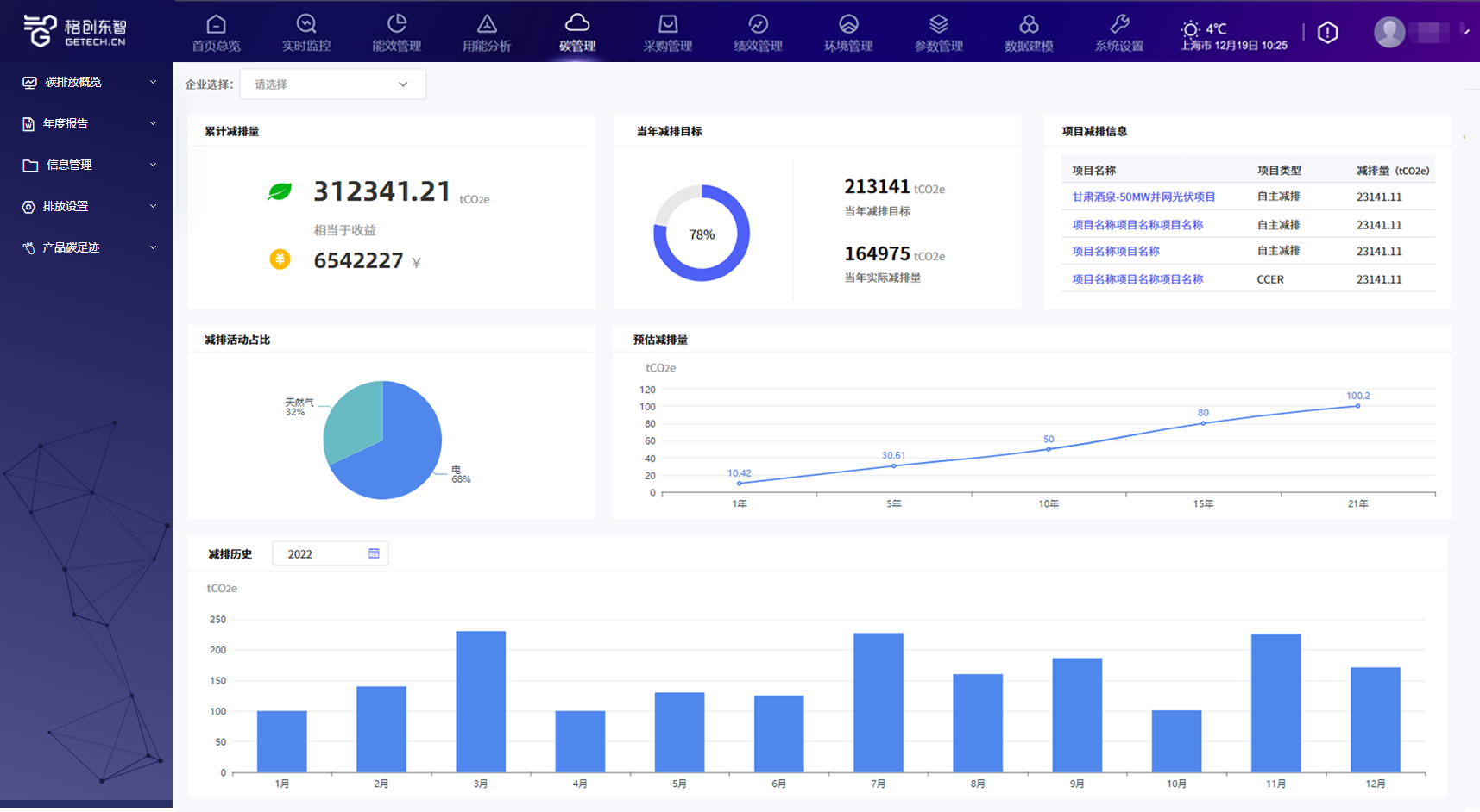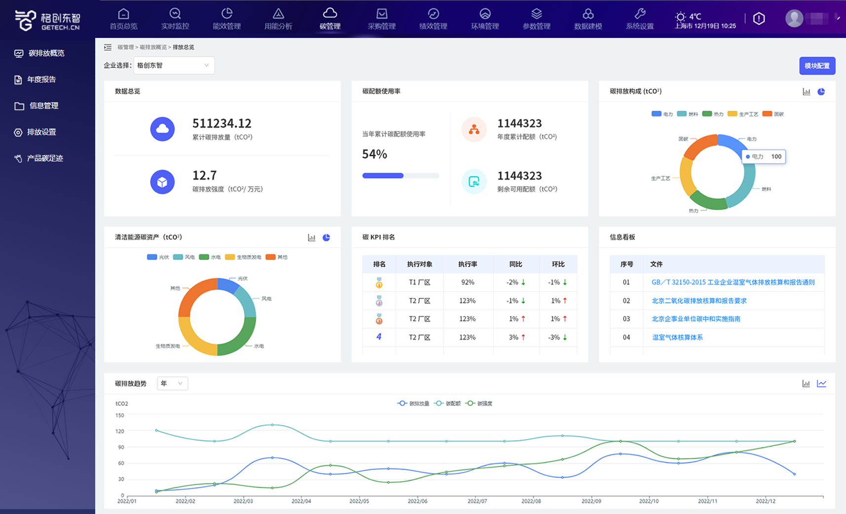 碳排数据可视化、碳目标设定跟踪、碳配额用量跟踪; ESG报告输出;控排企业碳核查,非控排企业碳盘查,推动节能降碳