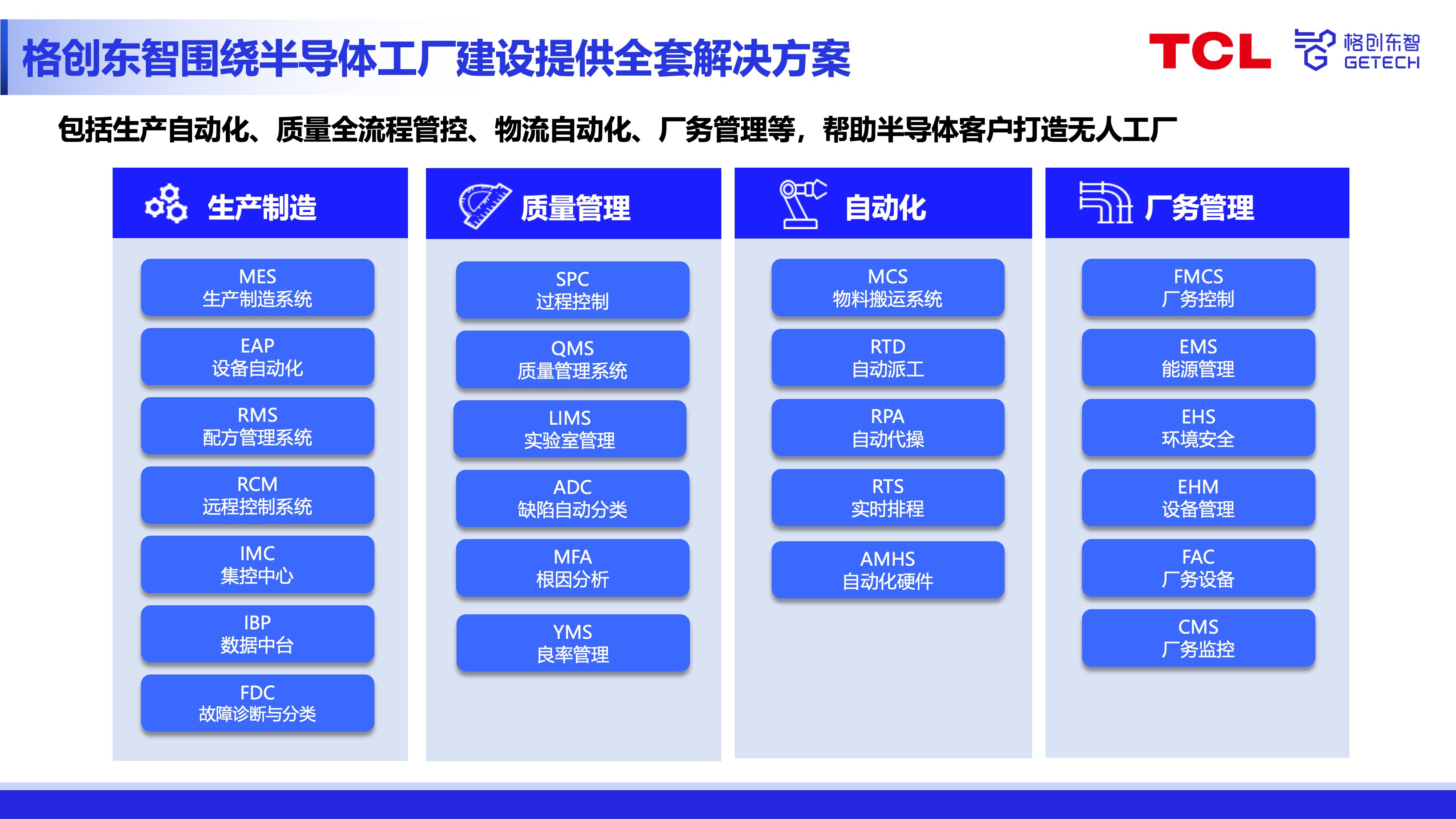 In recent years, new technologies such as the Internet of Things, cloud computing, big data, artificial intelligence, and 5G have continuously emerged, quietly掀起a wave of smart manufacturing. For the manufacturing industry, digital intelligence is another transformation and upgrade on the basis of digitalization. Through technical means such as big data and AI, it deeply挖掘data value, makes decisions and actions based on data, helps companies optimize business and management processes, and provides deeper and smarter decisions.Based on the new perspective of 'production-analysis-prediction', GETECH has built a fully domestic CIM overall solution for semiconductor smart factories, achieving transparent production execution, automated equipment management, efficient plan collaboration, accurate quality追溯, and logistics management, helping semiconductor companies increase capacity, reduce losses, improve yield, and optimize production and process design.