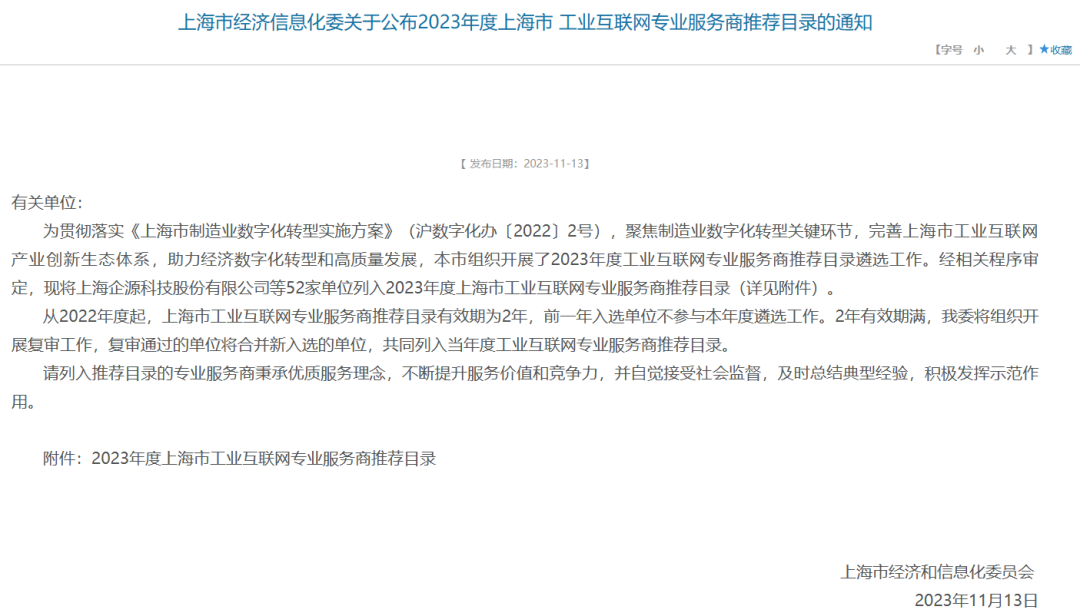 Recently, the Shanghai Municipal Commission of Economy and Informatization announced the 2023 Shanghai Industrial Internet Professional Service Provider Recommended Directory. The recommended directory is formed by the Shanghai Municipal Commission of Economy and Informatization to implement the 'Shanghai Manufacturing Industry Digital Transformation Implementation Plan', focus on key links of manufacturing digital transformation, improve the Shanghai industrial internet industry innovation ecosystem, assist economic digital transformation and high-quality development, and select a group of industrial internet professional service providers with strong technical strength, excellent service capabilities, and good market response citywide.