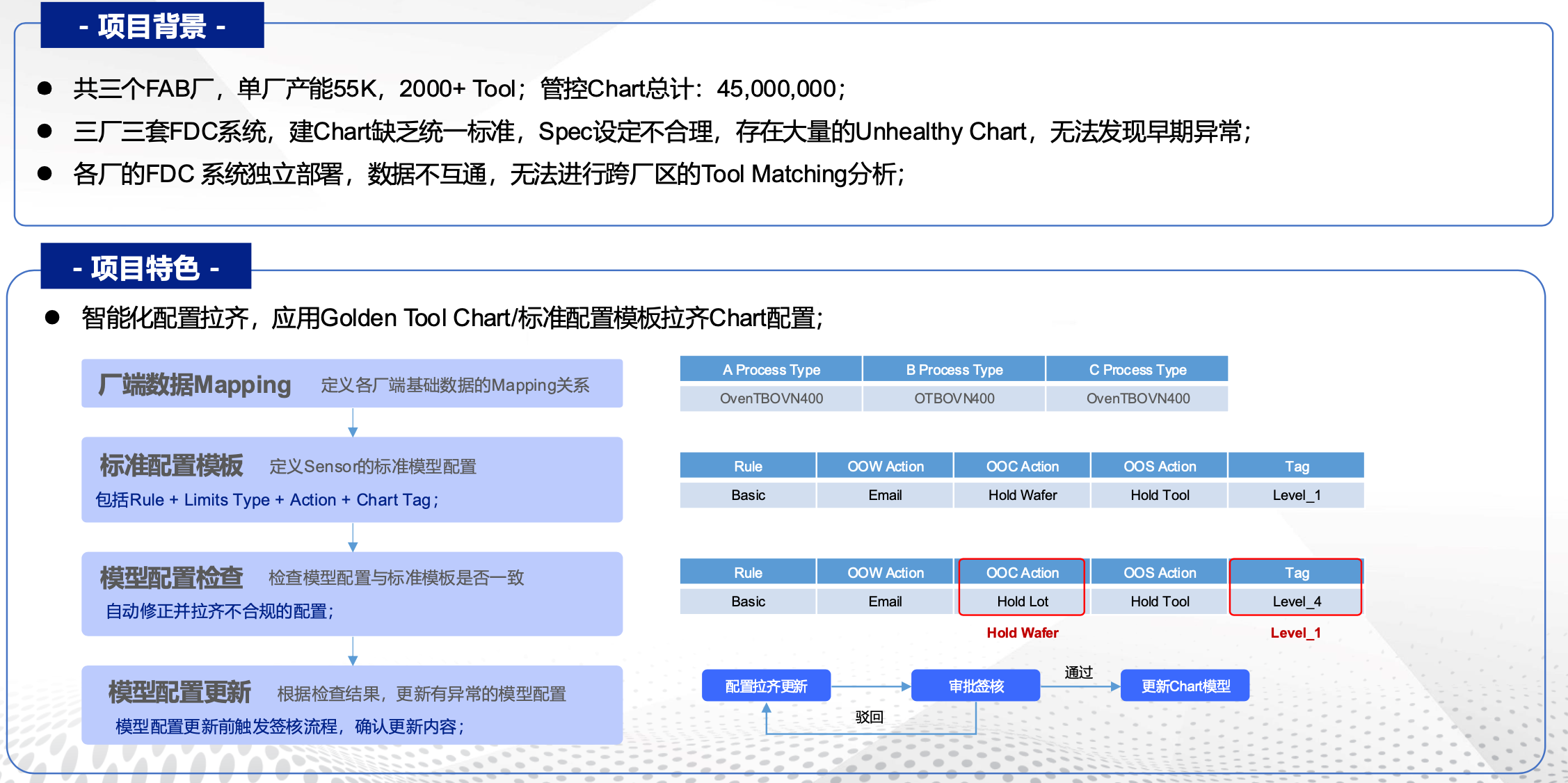 1. Group Deployment, Establishing a Collaborative Management System (1) Cross-Fab data management: Real-time synchronization of FDC data from all factories to the group platform, achieving millisecond-level response to equipment indicator anomalies; (2) Standardized configuration alignment: Establishing mapping rules for process types, sensor naming, etc., on the group FDC platform, automatically detecting and correcting over 90% of non-standard configurations; (3) Intelligent规格优化 management: Using historical data fitting algorithms to dynamically recommend optimal control limits, significantly improving anomaly detection rates while reducing无效告警.