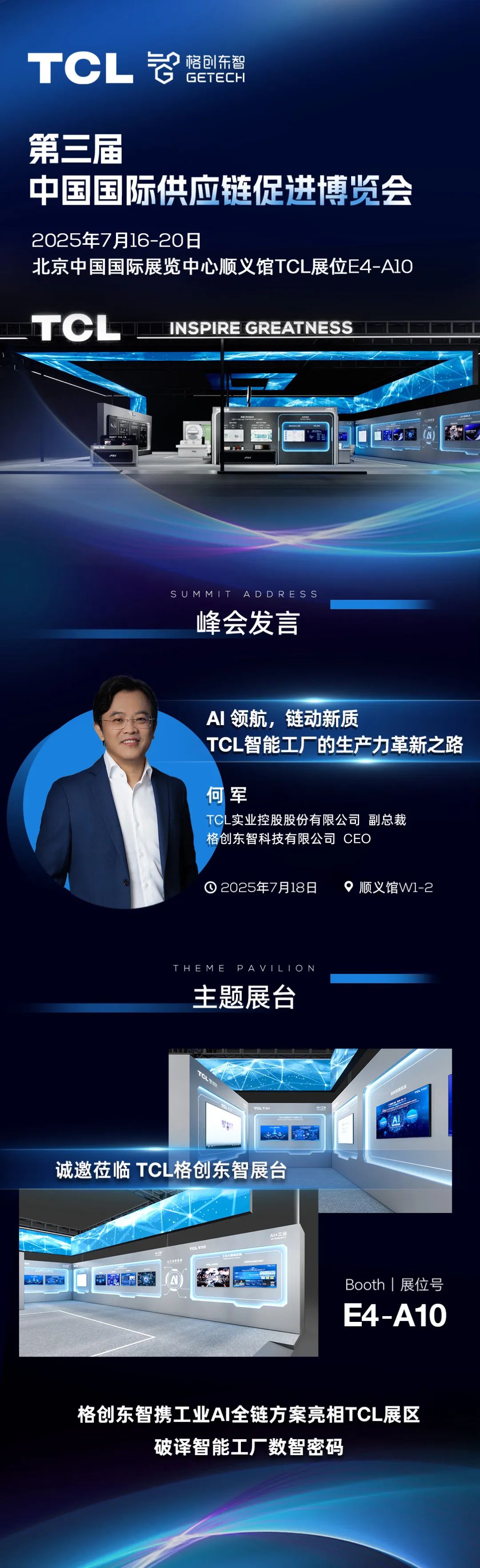 He Jun, Vice President of TCL Industries and CEO of GETECH, is invited to attend the Digital Technology Theme Event, delivering a keynote speech "AI Navigation, Chain-Driven New Quality: TCL Smart Factory's Productivity Innovation Path". GETECH showcases Industrial AI Full-Chain Solutions at Booth E4-A10. Welcome to visit, driving intelligent transformation of the industrial chain with innovation engines.