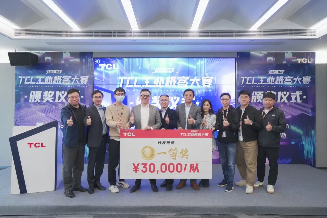 *TCL Technology COO Wang Cheng and GETECH CEO He Jun awarded the first prize to the winning team at the inaugural TCL Industrial Geek Competition.