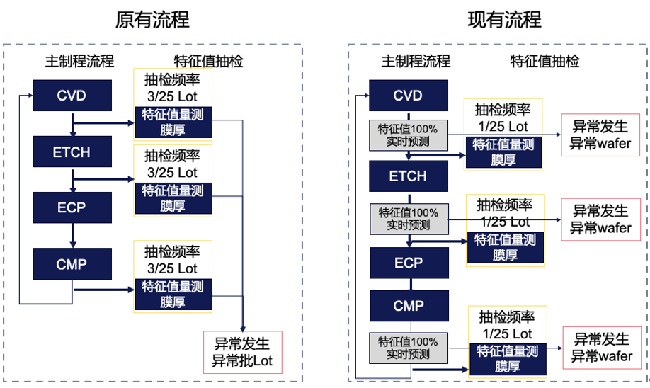 在集成电路产业链中,半导体制造是最重要的一环,是把设计落地、迈出走向应用的关键一步,但这又是极其复杂的一环。据相关资料显示,要制造一颗芯片,需要涉及到五十多个行业,2000-5000道工序。如下图所示,晶圆代工厂里繁复的制造步骤下每一个环节都给芯片制造厂商带来了巨大的挑战。以芯片制造中的CMP(化学机械抛光)为例,这是一项用于去除沉积金属或介质材料并平坦化晶圆表面的技术,是晶圆生产中的关键制程。这个概念看似简单,但在实际生产中,CMP要同时满足材料去除的均匀性、更高生产效率和更低成本的严苛要求,这就使其复杂程度大增。CMP机台构造和工作原理(sourse:未来智库)相关资料显示,CMP制程中会出现沟槽深度、金属膜厚波动等几十种缺陷,这些异常对产品电性参数和良率产生极大的影响。其中,膜厚的稳定对制程来说尤为重要。统计显示,CMP膜厚异常、缺陷与包括前程工艺、本制程的设备与制程参数、甚至材料批次等生产过程中涉及的多种复杂因素有关。在如此海量的因子影响并且相互关联的情况下,工程师无法通过过去的工具和技术很好地单独分析出实际的影响因子,提升良率,保证工艺的稳定和产品的质量。行业专家同时也指出,提高生产良率,将直接影响和优化生产周期,极大降低生产成本,从而强化产品以及企业的市场竞争力。而随着半导体制造生产流程和工艺越来越复杂,制造过程也越来越具有挑战,良率提升变得异常困难。从相关分析看来,造成这种困难的主要原因有以下几点:1.制程工序复杂。产品需要经过几百道复杂的工序加工,每个工序都要求几乎100%的良率,否则,良率乘积关系会迅速破坏整体良率;2.制程高度重入。产品需要多次重复进入相同的制程进行加工,每次都将面临渐进偏移(Shift)或突变漂移(Drift)等变异现象,品质问题的根源在于高变异;3.品质实时控制难。良率故障只能通过抽检检测发现。检测本身的滞后性和抽检的概率性,严重影响品质数据的实时获得,进而影响品质的实时控制;受限于技术,这其实是过去多年来困扰行业的一个难题,但进入最近几年,从业者似乎已经找到了一个新的答案——那就是工业互联网。