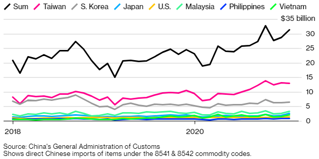 据彭博社统计,2020年,中国大陆的芯片进口额攀升至近3800亿美元,约占国内进口总额的18%。知名分析机构IC Insights的数据则显示,2020年,中国大陆的集成电路市场增至1434亿美元,然而其中仅有15.9%是由中国大陆生产的。如果仅统计总部位于中国大陆的公司的产值,则只有83亿美元,仅占中国2020年IC市场总量的5.9%。中国从各个地区进口芯片的统计(source:彭博社)作为一个坐拥全球最完整供应链的国家,中国在集成电路的设计、生产、封测、测试、材料和装备方面都有布局,但我们并没有获得相应的集成电路成绩。这一方面固然与我国上述领域都存在短板有关。更重要的是,在行业专家看来,缺乏以市场最优的成本、按时足量地生产出稳定、高品质半导体产品的能力,是中国半导体难以生产出具有市场竞争力产品的命门。