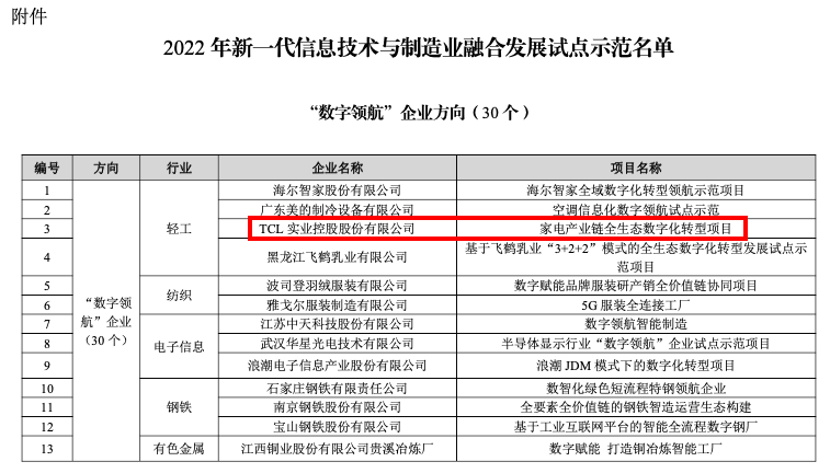 近日,国家工业和信息化部公示了《2022年新一代信息技术与制造业融合发展试点示范名单》,授予全国首批30家企业“数字领航”称号。TCL实业作为广东省唯二企业之一,获此殊荣!