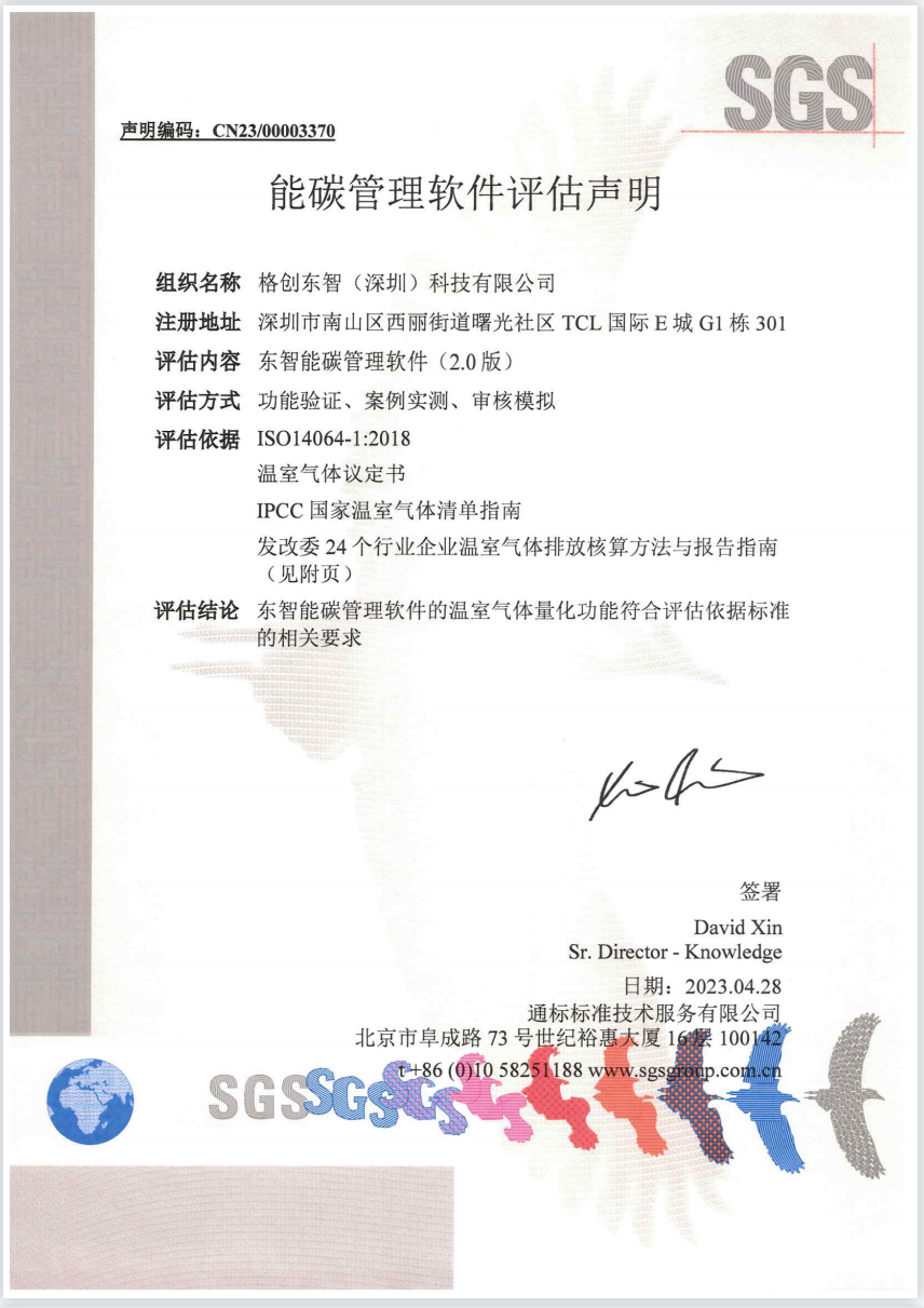 SGS根据《ISO14064-1:2018》、《温室气体议定书》、《IPCC国家温室气体清单指南》、《发改委24个行业企业温室气体排放核算方法与报告指南》等标准,以及英国环保署《UK Government GHG Conversion Factors for Company Reporting》、《Simapro 数据库》、《中国产品全生命周期碳系数集 (2022)》、国际及国内碳盘查与核查使用的主流数据库,通过功能验证、案例实测和审核模拟等方式对bbin宝盈东智能碳管理软件进行评估。评估结论显示: