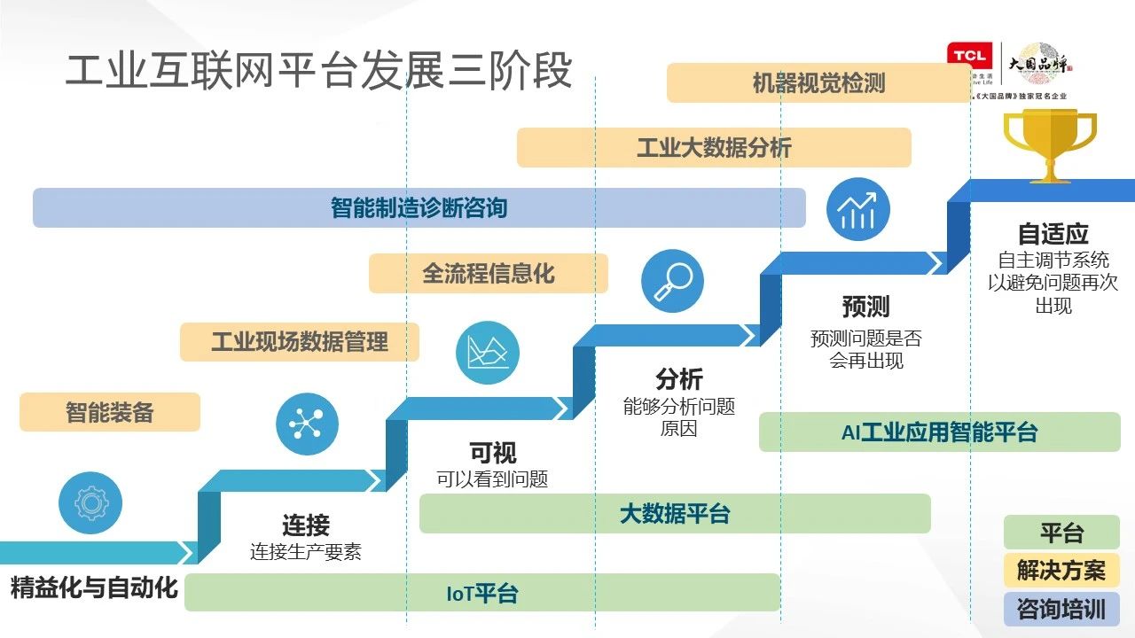 工业互联网平台发展的三个阶段:IoT平台阶段,实现了生产要素的连接和数据的可视化,积累大量数据;大数据平台,基于数据分析建模找到影响生产的因素,分析和解决问题;工业应用智能平台,基于人工智能的应用,应用到更多实际生产场景中。