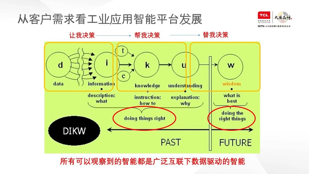 在解决上面这些问题的过程中,我们逐步加深了对数据和智能的理解,用一句话概括:广泛互联下数据驱动的智能。掌握了这句话之后,我们再做人工智能、做平台就有了基本的一个方向。而未来工业互联网平台的价值,也将从“用户做决策”,到“帮用户做决策”,最终 “替用户做决策”的价值升级!