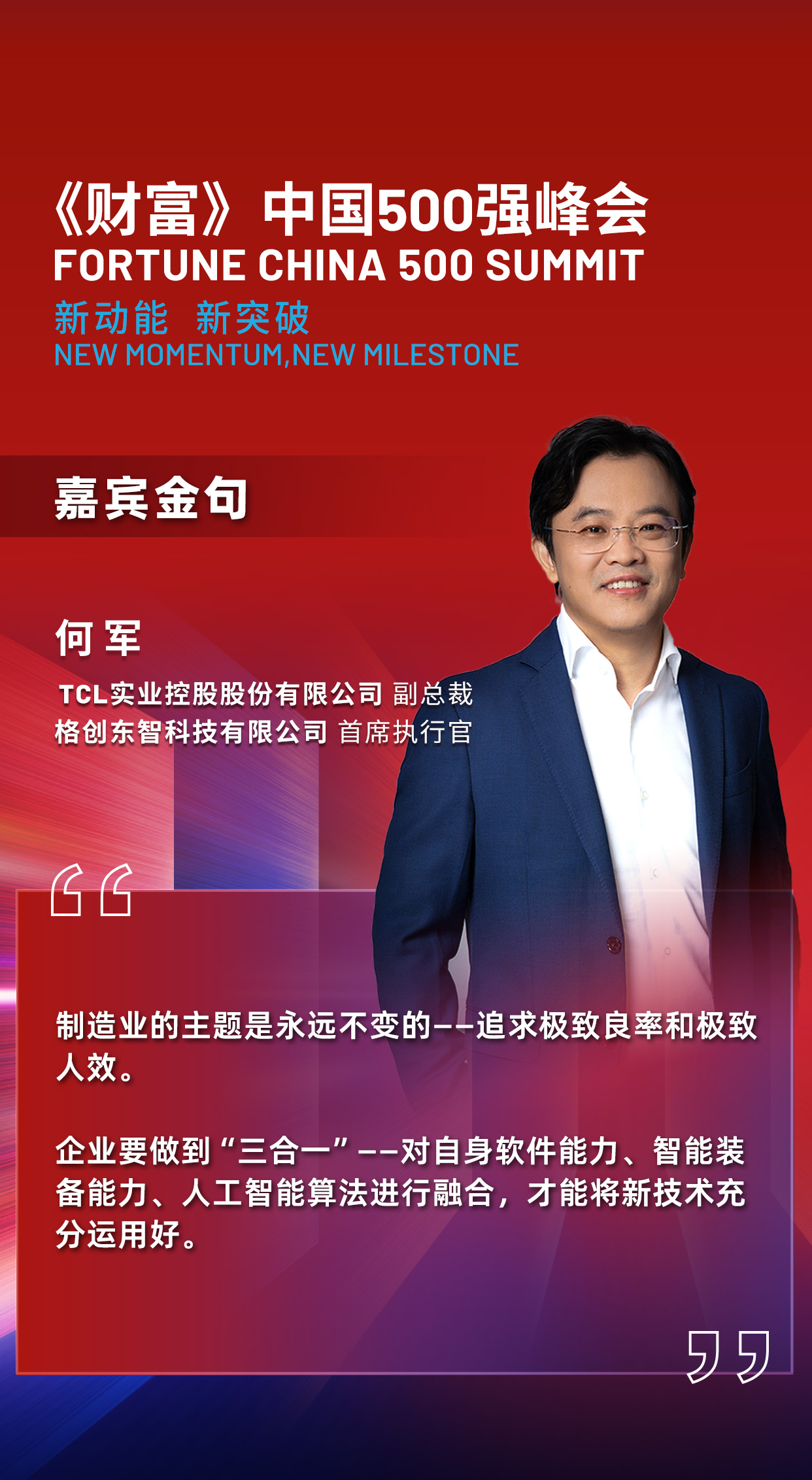 工业的未来从来不是一个定数,积极拥抱变化才能变中求定,定中谋变。10月17日,2024《财富》中国500强峰会在上海拉开帷幕,TCL实业副总裁、bbin宝盈东智CEO何军受邀出席“进击工业4.0”圆桌对话,与腾讯云副总裁/智能制造与智慧能源负责人曹磊、江森自控日立空调集团全球副总裁/中国东南亚及太平洋大区总经理关宇、新希望集团首席数字官/新希望数科集团首席执行官李旭昶等企业领袖,共同围绕工业智能化的路径和趋势给予深度研判,并就AI技术从研发到落地应用给出了系统性建议。