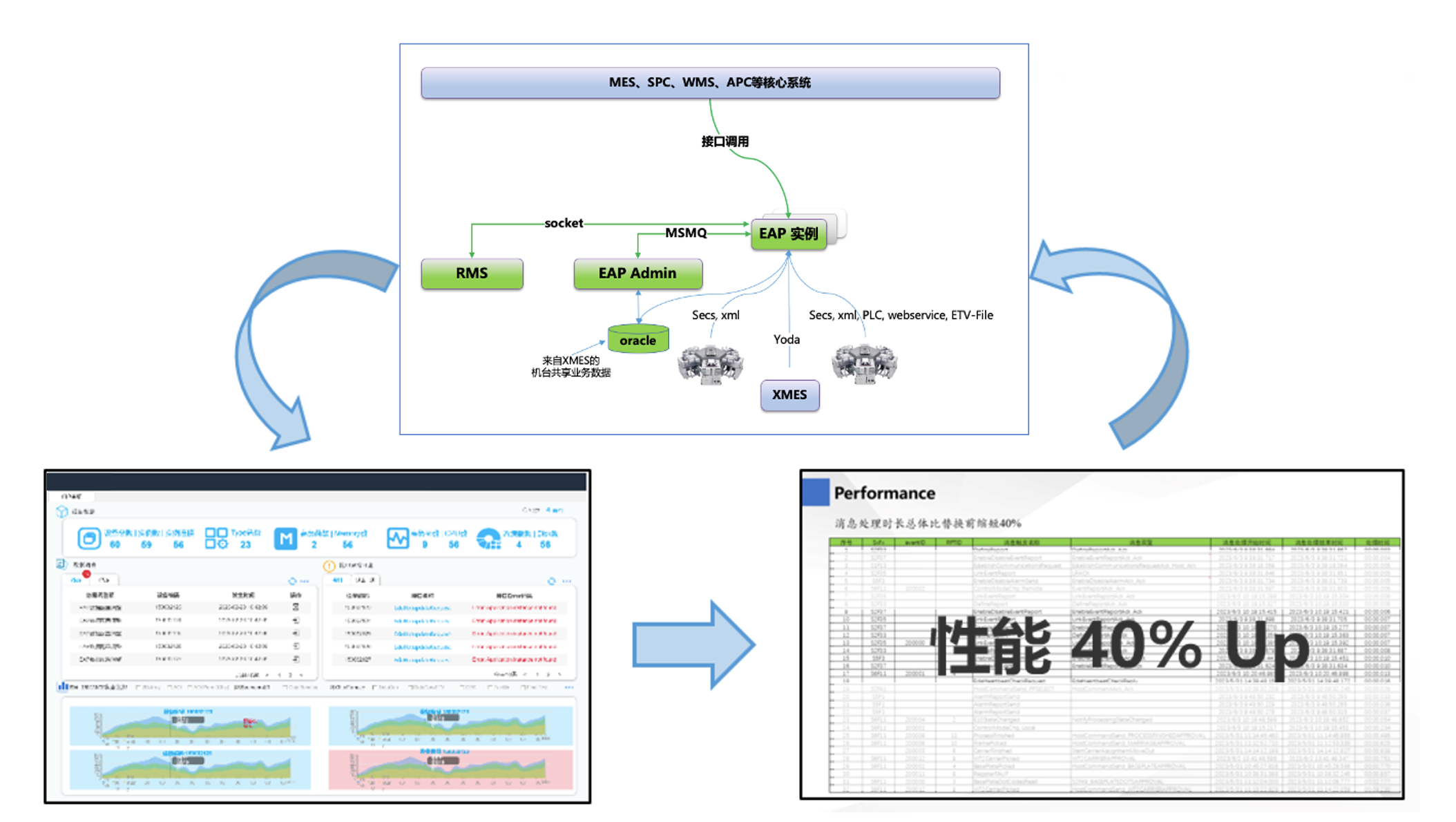 设备确保在制品(WIP)制程流畅互通,实时洞悉上下游状况; 独立作业控制设备及生产流向,生产过程不因上位系统异常影响; 配置各类Trigger,获取有效数据,减轻上位系统处理负担,消息处理性能提升40%。 2、提高产能和良率 EAP系统支持不停机更新和换版,大大提高机台稼动率和产能; 协同MES实现在制品帐料自动进出账,实现产品履历追溯; 同时收集WIP在各制程设备的Process数据,收集(可设定)设备的异常数据,便于对异常数据的分析,提高产品良率。 3、降低成本 实时掌握设备状况,快速排除异常原因; 流程化的开发工具,提升运维效率,降低运维成本; 完善的EAP管理平台,更新EAP无需借机,降低更新程序导致的成本损失。