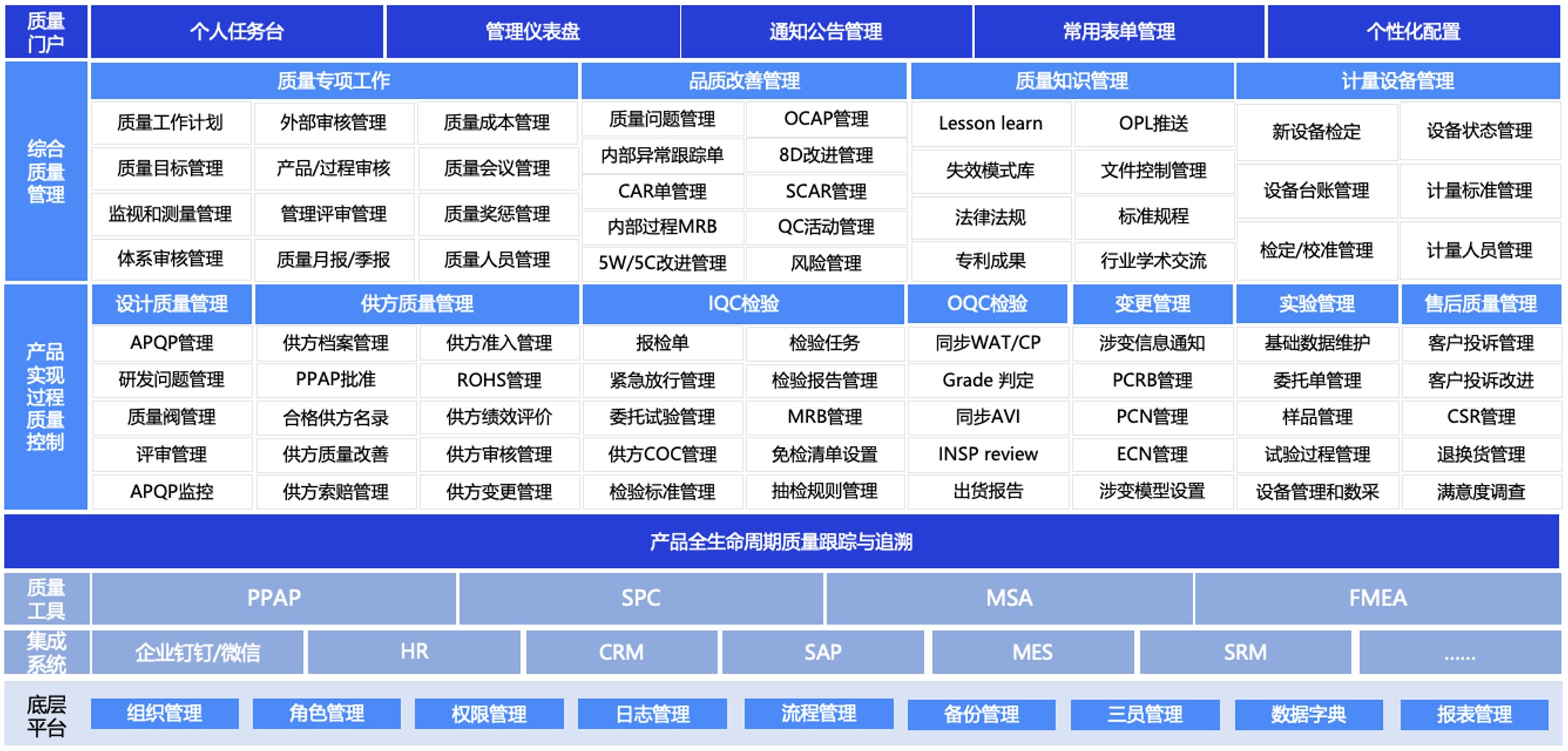 5)拉通企业IT及周边系统,业务流程上打通系统壁垒,同时对分散的质量数据进行重新梳理,构建质量数据标准,并将相关质量数据统一纳入到QMS系统管理。联动场景例如:CSR与产品管控的联动、异常处理与库存HOLD、WIP HOLD、产品召回的联动等。