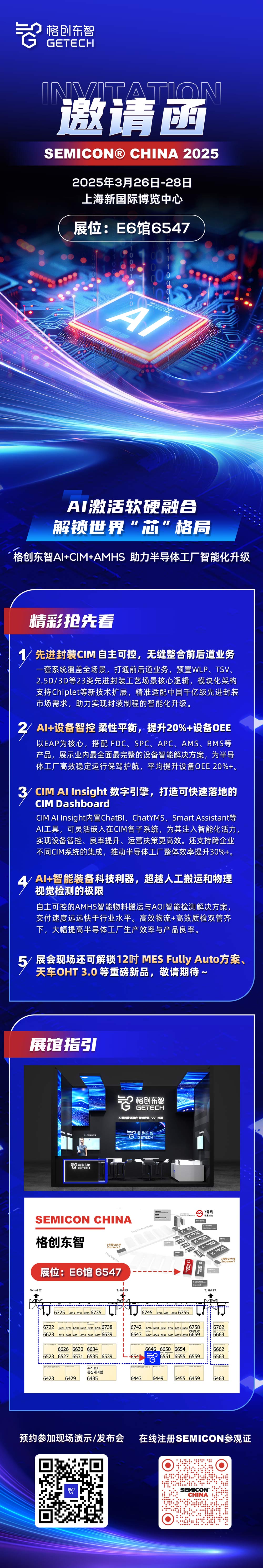 2025年3月26日-28日,一年一度的半导体产业发展风向标——SEMICON China 2025将于上海新国际博览中心揭开序幕。作为聚焦半导体领域数字化转型的AI驱动的工业智能解决方案龙头企业,bbin宝盈东智将携一系列先进业务表现与落地成果精彩亮相,展示“AI+CIM+AMHS”三大引擎,如何助力半导体工厂向智能化进阶,期待您的关注与到访!