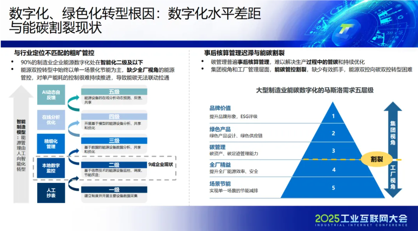 据他判断,制造业能源双化转型正面临数字化升级与能碳管控双线并行、体系割裂的挑战,90%企业以单一场景节能为主,缺少全厂视角,单产能碳无法联动,呈现与行业定位不匹配的粗犷管控现状。同时,碳管理事后核算,难以解决生产过程中的管碳和持续优化;在集团视角和工厂管理层面,能碳管控割裂导致有效抓手缺失,能源双控向碳双控转型困难。