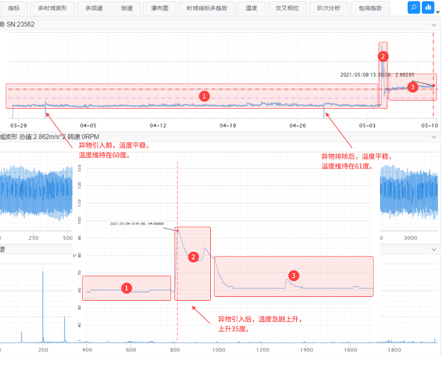 以PUMP1为例--DP非驱动端垂直向低频测点振动波动明显,异物引入导致转子轻微损伤所致,其劣化大体可以分为三个阶段:阶段一:3月28日(上线)-5月4日,设备运行稳定,未见存在明显的劣化,但3月31日(P1)和4月28日(P2)因设备报尾排压力异常存在短暂的停机,停机检查未见明显异常,后启机运行 ;阶段二:5月4日09:30-5月4日16:16,异物引入(体积较大的颗粒进入),导致PUMP排气不畅,振动急剧上升,同时伴随着温度急剧上升;阶段三:异物排除,PUMP运行状态改善,振动急剧下降,同时伴随着温度下降,但转子存在轻微损伤,振动和温度相较前期有轻微的上升,且开始缓慢劣化。① 5月4日因异物引入,导致DP转子损伤,目前处于缓慢劣化阶段;